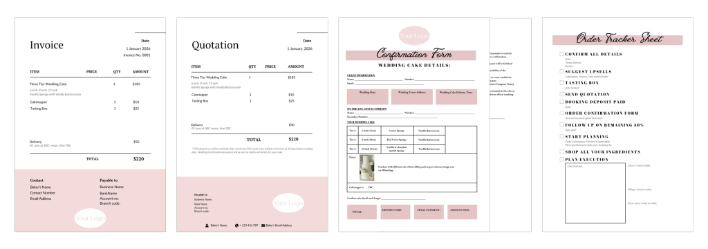 These ready-to-use templates will help you run your cake business professionally from day one. You’ll receive editable Invoice, Quotation, Order Confirmation & Contract, and Order Tracking Sheet templates that are fully customisable in Canva, making it easy to add your own branding. They save you time on admin, keep your orders organised, clearly outline pricing and terms with clients, and ensure your business processes look polished and professional.